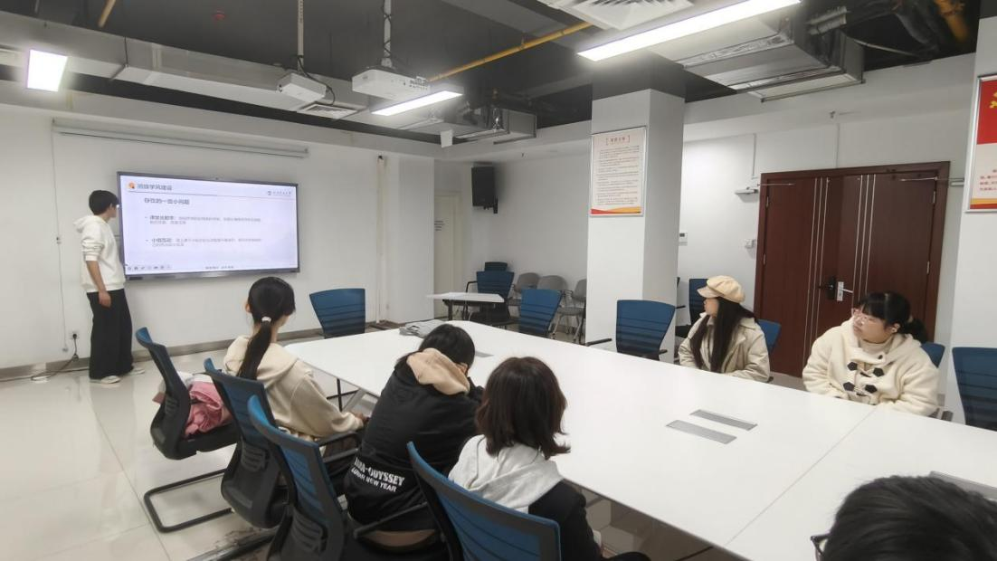 熊梓炀向全班同学介绍了班级学风建设的重要性,指出目前同学们在学风建设中的一些问题,并从四六级通过率、课堂到课率、课程通过率几个方面设置了学年班级目标,强调学风是学生综合素质的体现,但总体来看大家课堂上的投入和认真度不够多,并针对目前学风建设中存在的问题提出了新方向,要求大家共同维护良好的学风。