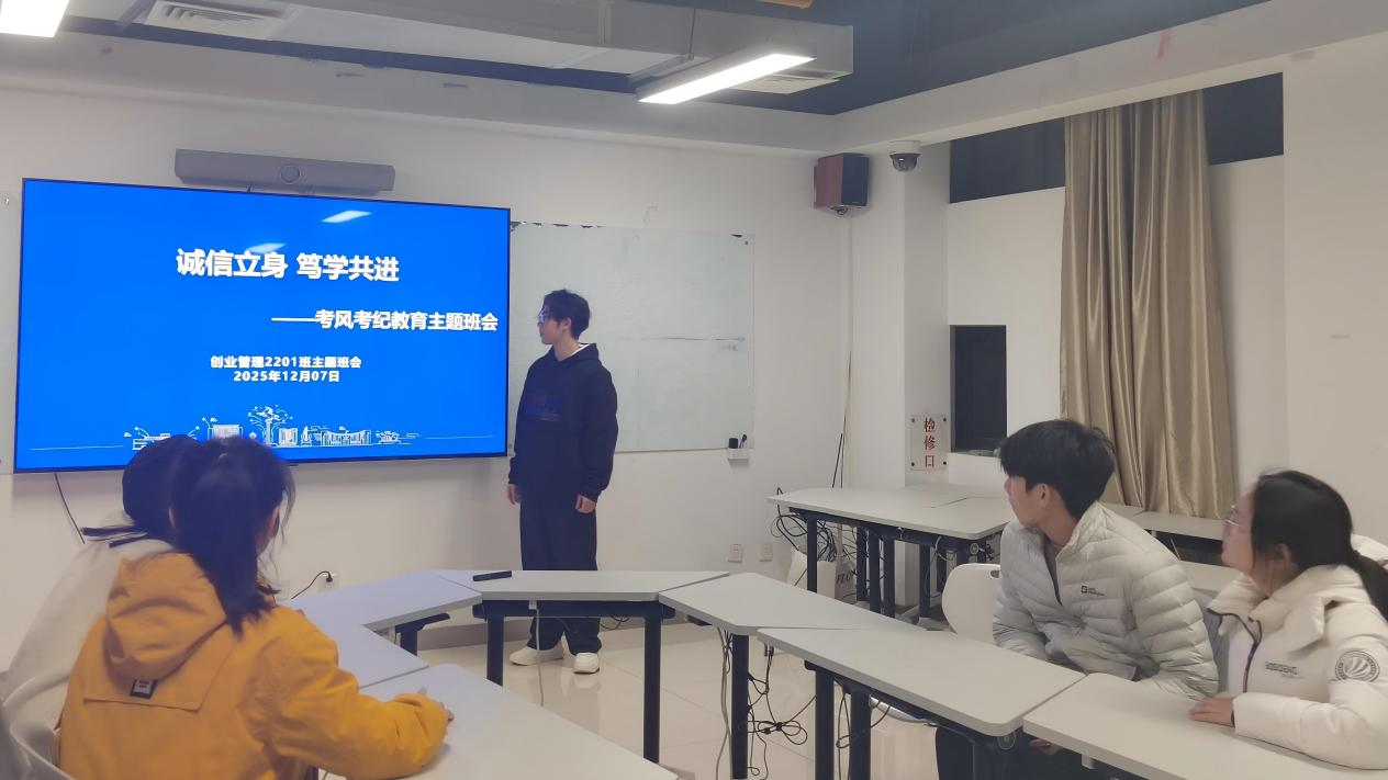 本次主题班会内容充实、形式严肃,有效增强了同学们的规则意识、诚信观念和备考信心,为营造风清气正、积极向上的班级学习氛围奠定了坚实思想基础!期望创管2201班学子常怀敬畏之心,恪守诚信之本,将考场上的“清白”答卷,延伸为人生的端正品格,在未来的广阔天地中行稳致远。