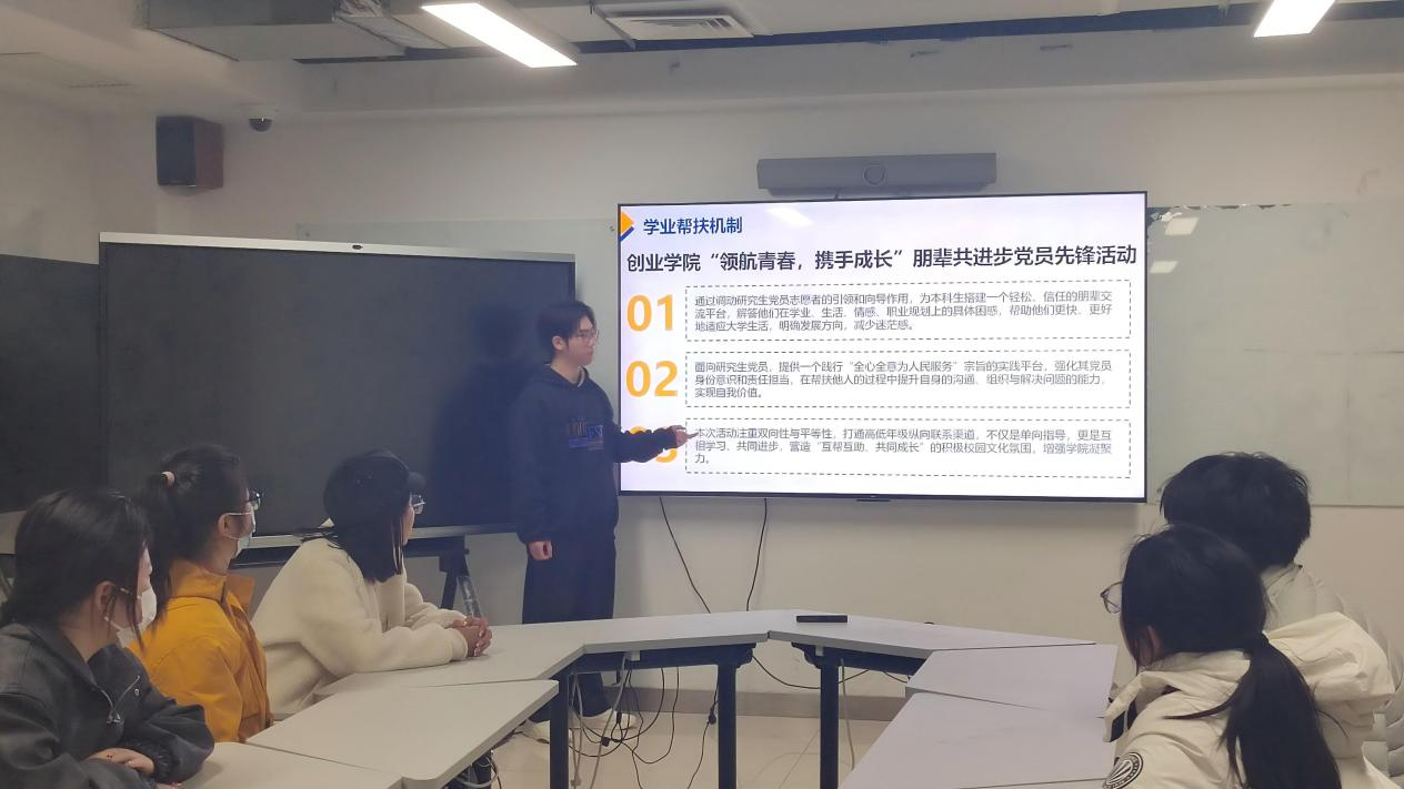 在“学业帮扶机制建设”环节,班会重点介绍了学院“领航青春,携手成长”朋辈共进党员先锋活动。该活动通过研究生党员与本科生的结对帮扶,搭建学业、生活、职业规划的交流平台,实现“互帮互助、共同成长”。