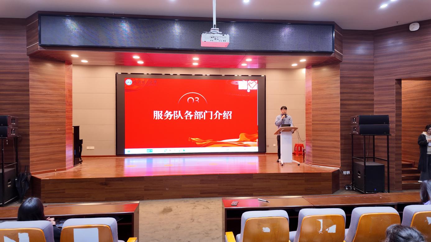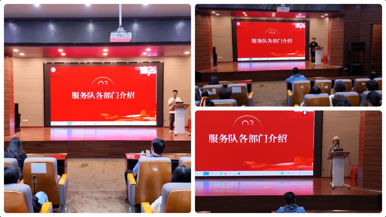 为了让新成员们更快地融入集体,了解服务队各个部门的运作,各部门干部依次上台进行了详细的部门介绍。服务部部长叶炜鹏、宣传部部长沈忱、办公室部长王梓馨分别就本部门的职能分工、工作内容等进行了阐述。通过他们的介绍,新队员们对服务队的具体工作有了更直观的认识。